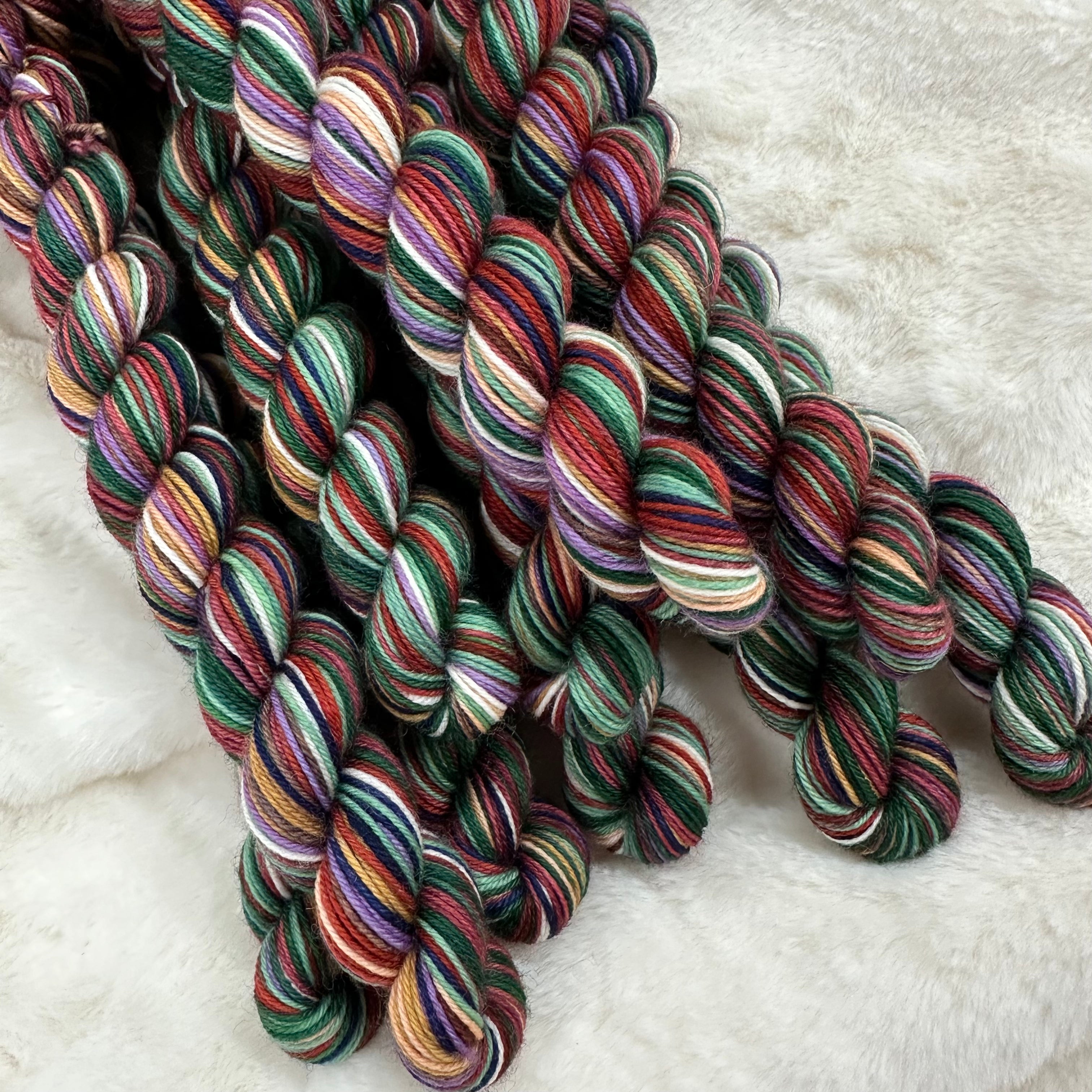 All mini skeins are 20 gram skeins and are self striping in the color way shown.